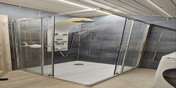 Entrée donnant aux escaliers. Coin cuisine avec machine à laver intégrée, ouverte sur le coin à manger et salon avec un canapé-lit 120 x 200 et un Home Cinema. Salle de bains avec douche à l’italienne et WC. Mezzanine en forme de Tiny House avec 2 matelas 90 x 200.